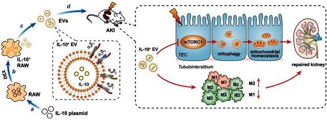 在动物模型中,IL-10+ EV可以显著改善I/R诱导的AKI,保护肾功能,减轻肾小管损伤。机制研究发现,IL-10+ EV通过抑制mTOR信号通路活化,上调TEC线粒体自噬水平,维持线粒体形态和功能稳态,包括减少线粒体ROS产生、改善线粒体呼吸功能和膜电位,从而减轻小管细胞损伤。此外,IL-10+ EV还可诱导间质巨噬细胞向M2型转化,促进肾脏的损伤修复。同时,在顺铂诱导的AKI小鼠损伤模型中,IL-10+ EV也展现出良好的治疗效果。此外,研究团队还观察了IL-10+ EV能否抑制AKI向慢性肾脏病(CKD)转变。令人鼓舞的是,在I/R损伤后4周,IL-10+ EV早期治疗可以显著减轻肾脏病理损伤和纤维化,抑制胞外基质的堆积和炎症细胞浸润,表明该疗法有可能被用来预防AKI向CKD转变。