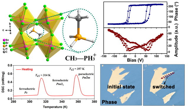 图1. 三维(CH3PH3)SnBr3的晶体结构、相变行为和铁电性质