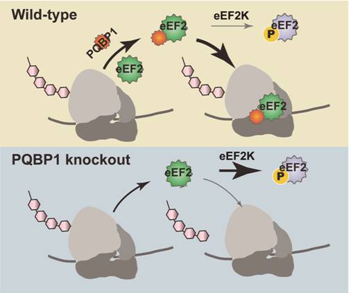 针对该问题,韩俊海团队制备了PQBP1基因的条件性敲除小鼠,发现在海马神经元中敲除PQBP1导致认知功能显著下降,并揭示基因条件性敲除小鼠的认知功能障碍是由于代谢型谷氨酸受体依赖的突触长时程抑制受损所引起的。进一步研究揭示PQBP1竞争性地结合非磷酸化的翻译延伸因子eEF2,抑制eEF2K介导的eEF2磷酸化过程,调控了代谢型谷氨酸受体依赖的突触长时程抑制。研究显示在正常小鼠的海马中注射干扰PQBP1/eEF2结合的多肽,同样导致mGluR-LTD受损,引起认知功能障碍。该研究还揭示PQBP1通过抑制eEF2K介导的eEF2磷酸化调控蛋白质翻译的机制在所有细胞中普遍存在,PQBP1作为eEF2K/eEF2通路的一种全新调控方式,为PQBP1突变或多拷贝重复导致智力障碍的致病机理提供了新的解释。同时,该研究为eEF2/eEF2K通路异常相关的神经精神疾病、病毒感染以及癌症等疾病提供了潜在的治疗靶点。