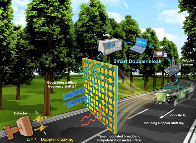 【东大新闻网4月19日电】(通讯员 张信歌)近日, 毫米波国家重点实验室崔铁军院士团队的蒋卫祥教授等与新加坡国立大学仇成伟教授合作研究,在信息超材料领域取得新进展,设计了宽带全极化时间调制可编程超表面和自适应时变控制系统,并在此基础上研制了一种工作于微波频段的智能速度隐藏器件。该器件能够根据运动目标的速度自动隐藏多普勒频移,而无需任何人为手动操作。该相关研究成果以“Smart Doppler Cloak Operating in Broad Band and FullPolarizations”为题于4月14日在线发表在国际学术期刊《Advanced Materials》上。