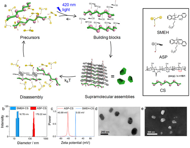 针对这些问题,该团队通过研究磺酸化部花青衍生物(SMEH)的光致异构化过程,发现其在光照条件下可转变为螺吡喃型阴离子两亲分子(ASP),而在室温下又可通过热耗散的形式逐渐恢复至SMEH的状态,据此提出该分子是一种“光诱导两亲分子”。通过将该分子与阳离子聚合物壳聚糖(CS)在水相混合,即可简便地构筑出光作为能量供给的人工超分子耗散自组装体系。由于光功率密度和温度分别对SMEH光致异构化和ASP的热耗散速率产生明显的影响,因而该耗散自组装体系的寿命可通过控制光功率密度和温度在几分钟到几小时的范围内进行调节。通过将不同发光性质(聚集诱导淬灭/聚集诱导发光)的荧光分子作为模板负载在该耗散自组装体系中,该耗散自组装体系可以实现这些荧光分子随时间变化的聚集诱导淬灭/聚集诱导发光的过程,并且发光过程变化的时间也可通过光功率密度以及温度进行调节。此外,负载了染料的该耗散组装体实现了细胞内随时间变化的动态成像功能。因此该光供能的耗散自组装体系为传感、智能发光器件等应用方面提供了可能的策略。