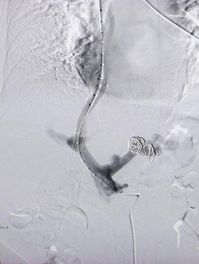 手术在局麻下进行,经右侧颈静脉穿刺,置入专用的导管鞘,用穿刺针经肝静脉穿刺至门静脉,并用球囊扩张,建立肝静脉-门静脉通道,再将可控支架植入,从而建立起门静脉的分流道,通过造影和门静脉测压,反复调整可控支架的直径,最终达到理想的效果。手术过程顺利,目前该患者正在进一步康复治疗中。
