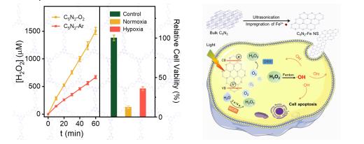 进一步利用C5N2在乏氧环境下优异的双氧水光合成性能,构建了芬顿反应体系,在乏氧与常氧条件下,均表现出显著的杀灭肿瘤细胞的效果,展现了全水解双氧水光催化剂在肿瘤治疗中的应用前景。同时,双氧水优异的荧光性能、良好的生物相容性以及高稳定性,也为建立同步成像和治疗系统提供了潜在的可能。