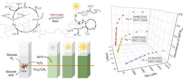 鉴于此, 张袁健团队报道了一种铜单原子催化剂(CuSAC6N6),它由电子供体-π-受体桥联的新型拓扑结构氮化碳(C6N6)和铜原子构成。CuSAC6N6不仅可以通过结合态铜-氧中间体途径实现基础氧化反应,还可以在相同条件下通过光激活游离态自由基途径引发第二条增益反应。CuSAC6N6独特的拓扑结构以及电子给体-π-受体桥联官能团促进了分子内电荷的分离和迁移,从而排除了上述两种催化途径之间电子转移的干扰问题。实验结果证明了CuSAC6N6不仅具有优异的基础活性,并且在室内照明灯照射下,还可以获得高达3.6倍的增益效应。基于CuSAC6N6的自适应能力,该团队进一步构建了体外智能切换灵敏度和线性检测范围的葡萄糖智能生物传感器。考虑到光照优异的时空分辨率和高度可控性,该研究报道的自适应生物传感器将为智能人工设备提供集成度更高的动态化学传感界面。