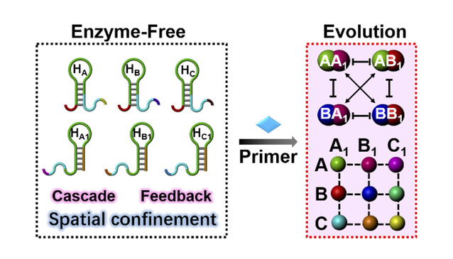 受细胞内动态生物分子网络启发, 张袁健/周志新教授课题组利用无酶催化核酸发夹组装反应,演化生成多种动态核酸分子网络,进一步将级联、反馈和限域效应等生物放大功能和动态核酸分子网络的特性相融合,结合microRNA触发的催化发夹组装循环反应,发展多种基于动态核酸分子网络多信号协同响应的超灵敏体外检测分析方法和活细胞原位多组分成像分析方法。该方法有望提高低丰度靶标检测时的可靠性,为重大疾病的早期诊断提供技术支持和方法支持。
