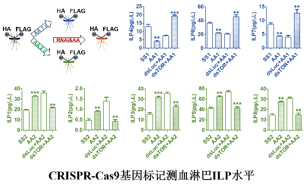 埃及伊蚊(Aedes aegypti)传播登革热、寨卡病毒、黄热病等多种烈性病毒,对人类健康构成了巨大的威胁。雌性埃及伊蚊需要吸食脊椎动物的血液来产卵,因此它们成为毁灭性人类疾病的传播媒介。阐明营养和代谢影响雌蚊繁殖的分子机制对于实现蚊虫种群控制至关重要。传播疾病的雌性埃及伊蚊经历了双相进食模式,从碳水化合物(花蜜)转向蛋白质(脊椎动物的血液),以确保以确保生存、繁殖和寻找宿主。源自宿主血液的氨基酸(AA) 和营养物质可激活卵黄发生并促进蚊子的胚胎发育。昆虫胰岛素样肽(ILPs),属于胰岛素超家族,对于雌性蚊子的繁殖、调节糖原和脂质代谢以及其他重要功能是不可或缺的。然而,在蚊子生殖过程中,ILPs 如何协调其活性以响应蚊子繁殖中AA 的流入尚不清楚。