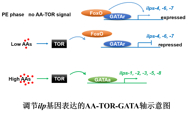 此项工作揭示了埃及伊蚊中存在的TOR-GATA开关机制,可控制依赖氨基酸信号的ILPs基因表达,以调节生殖周期中的营养代谢。通过AA 输注与 RNA 干扰 TOR相结合揭示了它们对ILPs 的不同作用,发现雌性埃及伊蚊中AA-TOR信号通路能够差异性调控8个ILPs基因的表达,提高了几种 ILPs 的循环水平,但抑制了其它ILPs。同源异构体特异性CRISPR-Cas9 基因组编辑和染色质免疫沉淀测定的实验进一步表明,ilp4、ilp6 和ilp7 基因的表达受到低AA-TOR 信号传导的 GATA 阻遏物 (GATAr) 异构体的抑制,而 ilp1、ilp2、ilp3、ilp5 和ilp8的表达则受到高AA-TOR 信号传导的 GATAa异构体的激活。GATAr和GATAa均影响埃及伊蚊卵子发育和脂质-糖类稳态,其中GATAr敲除导致卵巢泡变小、脂类积累减少和糖原水平升高,GATAa敲除情况则与之相反。FoxO 是胰岛素通路中的下游转录因子,参与 TOR-GATAr 介导的 ilp4、ilp6 和ilp7基因抑制。综上所述,这项工作探明了AA-TOR 信号和TOR-GATA开关机制通过调控蚊子中的ILPs调节适应性生理反应以应对营养代谢动态变化。对于实现蚊虫的有效防控和维护全球公共卫生安全具有重大意义。