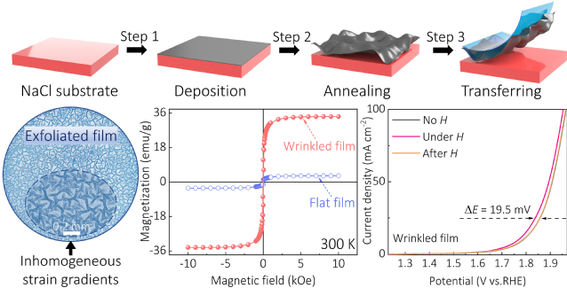 功能材料的自支撑薄膜可通过应变和应变梯度调控特性,从而拓宽其应用领域。 徐庆宇教授和范奇副教授合作提出一种系统的方法,利用NaCl衬底的膨胀收缩和界面的弱范德华相互作用,通过脉冲激光沉积制备自支撑CrMnFeCoNi高熵合金薄膜,当薄膜转移至粘性手柄时会形成具有非均匀应变梯度的褶皱。团队证明非均匀梯度的外部应变(挠曲磁效应)可以诱导褶皱高熵合金薄膜中从FCC到BCC的部分结构相变,使其室温饱和磁化强度相比于无应变的平整高熵合金薄膜提高十倍。此外,在施加外部磁场后,由于褶皱和平整高熵合金薄膜中电子散射引起的电子转移行为不同,它们的磁电化学响应呈现出截然相反的图景。该工作为通过复杂的应变几何结构调控物理和化学特性提供了一种前景广阔的策略。