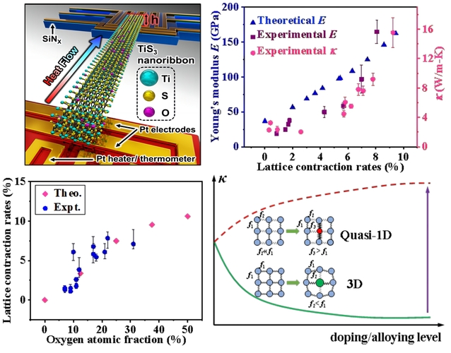 针对上述问题,陈云飞教授团队在准一维范德华晶体TiS3纳米带中掺杂氧原子,并发现室温附近沿着b轴方向可实现7.4倍的导热系数提升。通过原子力显微镜、高分辨透射电子显微镜、EDS和XPS测量发现,导热系数增加的原因是杨氏模量的增加,内在机制是氧原子掺杂引起的晶格收缩。进一步利用第一性原理计算发现,在准一维材料中掺杂小直径原子会沿着纳米带方向引起晶格收缩,从而增强原子间作用力;更重要的是在其他两个方向上由于弱的范德华作用,晶体结构和原子间相互作用没有明显改变。二者结合使得纳米带方向上的声子速度大大提升,从而实现导热系数的提升。与准一维材料相比,在三维晶体材料中掺杂会在所有方向上引起质量、晶格和势能的畸变,大大增加声子散射、降低导热系数。这项工作为低维材料导热系数的主动调控尤其是增强调控提供了一条崭新的路径。