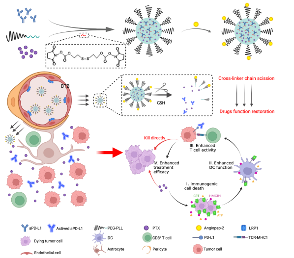 利用免疫检查点阻断剂(ICB)治疗胶质母细胞瘤(GBM)的免疫疗法前景广阔,但其临床疗效受到血瘤屏障(BTB)和免疫抑制性肿瘤微环境的挑战。在本研究中,aPD-L1被装载到还原响应型胶束中,并通过PTX诱导的免疫原性细胞死亡(ICD)进一步增强ICB疗效。胶束能有效穿过BTB并保留在还原性肿瘤微环境中,而不会改变aPD-L1的生物活性。aPD-L1和PTX的联合应用显著抑制了原发性和复发性GBM,积累细胞毒性T淋巴细胞,从而提高ICB的疗效,并在原位GBM携带小鼠中诱导了持久的免疫记忆。这种共包封的方法有利于抗体的高效递送,并与化疗药物诱导的ICD相结合进一步提高疗效。本研究证明了化疗免疫疗法可以重编程局部免疫,从而增强抗GBM的免疫疗效。