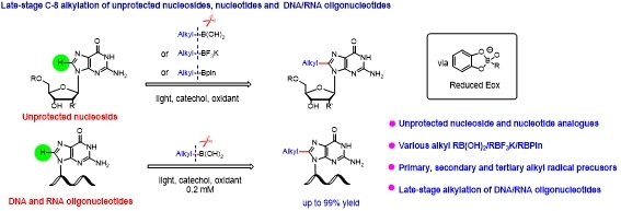 作者首次报道了一种通过邻苯二酚促进、光介导的Minisci反应的合成方法,即用烷基硼酸及其衍生物高收率、高选择性地获得鸟苷及其类似物(RNA/DNA寡聚核苷酸中鸟嘌呤)的C8位点直接烷基化产物:首先完成了鸟嘌呤及其类似物C8位以及尿嘧啶及其类似物C5位直接后修饰,接着对复杂的二核苷、环二核苷以及单/双/三磷酸核苷酸进行烷基化修饰,最后对挑战性更高的RNA/DNA寡聚核苷酸高选择性实现鸟嘌呤的C8位点直接进行官能化。该方法具有高效、温和、水相兼容以及底物范围广等特点,突破了前人对核苷、核酸烷基化方法的局限性(反应条件苛刻、步骤较长和底物拓展范围窄等)。这一高效的后修饰方法以及丰富的产品化合物库,在核酸药物开发和核酸化学生物学研究等领域具有广谱适用性。