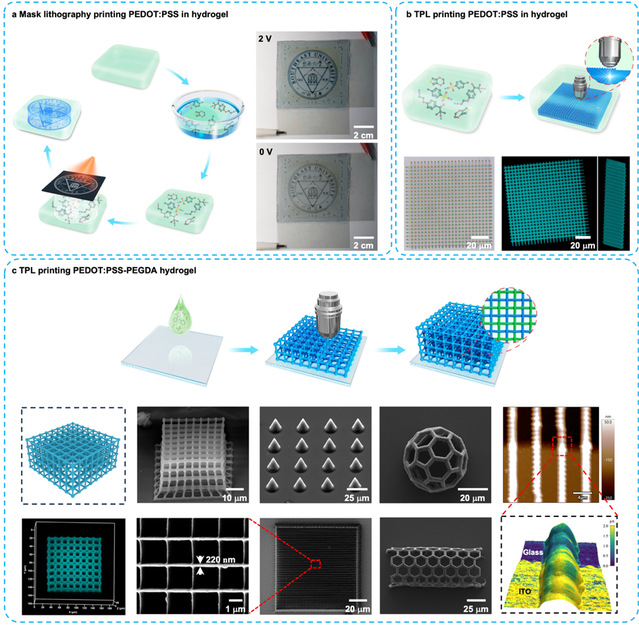 为了突破这些技术瓶颈,顾忠泽教授团队与谢劲教授、韩杰副研究员团队提出了一种基于时空可控光诱导氢原子转移(HAT)反应的导电聚合物光聚合方法。他们开发了一种高效的HAT催化剂BPED,通过光引发双重HAT反应,实现了导电聚合物的快速光聚合。以PEDOT:PSS为例,标准反应体系使用3,4-乙烯二氧噻吩为单体,聚苯乙烯磺酸钠为对阴离子,Irgacure 2959为光引发剂,对甲苯磺酸(TsOH)为掺杂剂。在空气中,15分钟内可完成聚合反应。由于Irgacure 2959和BPED都具备优异的双光子吸收性能,该反应促成了PEDOT:PSS结构的双光子打印。在固化的水凝胶中,该方法能够打印三维PEDOT:PSS导电通路。更进一步,该技术可以同时引发了水凝胶前体的自由基聚合交联和EDOT的聚合反应,从而构建出亚微米分辨率且可编程的三维导电微纳结构。该创新性的光聚合方法有效解决了3D打印中导电聚合物的兼容性和光吸收问题。
