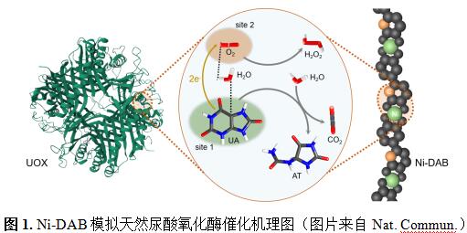 辅酶非依赖性氧化酶是一种双底物酶,在氧气参与下催化小分子底物氧化,同时还原氧气产生水或过氧化氢,这类酶的高特异性源于独立的底物和氧气结合双位点。例如,尿酸氧化酶(UOX)具有Arg-176等组成的尿酸结合位点, 和Thr-57等组成氧气结合位点,能高特异性催化尿酸氧化。受天然酶选择性机制启发,张袁健团队提出在单原子纳米酶中引入一个竞争性非金属位点的策略,通过调控配位聚合物催化剂,得到了金属-配体双位点类尿酸氧化酶(Ni-DAB,图1)。Ni-DAB可以高特异性催化尿酸氧化,但对其他底物无显著活性。