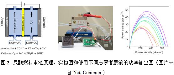 作为应用案例,该研究进一步利用Ni-DAB构建了尿酸生物燃料电池(图2),由于Ni-DAB对尿酸的高特异性催化氧化,避免了其他副反应,提高了电池的输出效率,可利用人体尿液直接输出电能,有望用于植入医疗设备和野外极端条件紧急呼叫设备供电以及空间站宇航员尿液高效利用等领域。该研究提出了模拟天然酶选择性机制来提高纳米酶特异性的新方法,展现了人工模拟酶的重要应用前景。