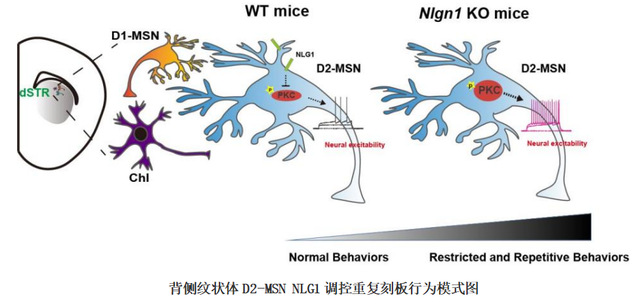研究团队发现自闭症关联分子Neuroligin1 (NLG1)缺失可导致小鼠产生自闭症样的过度自我理毛和挖掘行为,并伴随背侧纹状体D2-MSN神经元兴奋性异常升高,在该神经元中补充NLG1或抑制神经元活性均可挽救小鼠的过度重复刻板行为;在野生型小鼠中激活D2-MSN可诱导过度重复刻板行为产生,并且在体光纤记录结果显示D2-MSN的钙活动与动物刻板行为的产生呈显著正相关;最后,研究团队通过单核细胞测序(sn-RNAseq)发现NLG1缺失可导致D2-MSN中PKC信号通路上调,抑制PKC活性同样可逆转突变小鼠的行为异常。本项研究揭示了自闭症关联分子NLG1调控重复刻板行为的精确机制,为治疗自闭症提出了新的潜在靶点和思路。