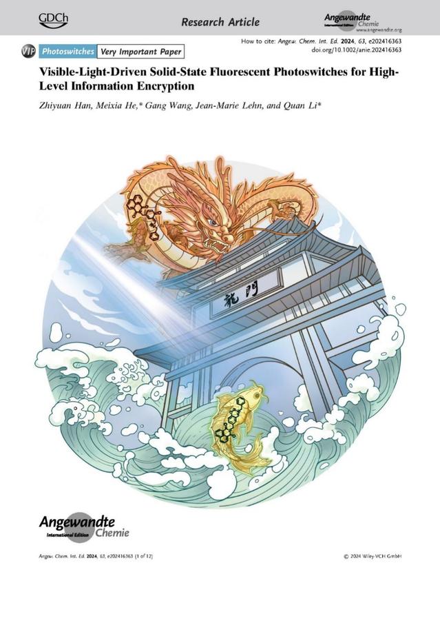 近日, 智能材料研究院院长、首席科学家、化学化工学院李全团队在开发可见光驱动固态荧光光开关及高阶信息加密方面取得重要研究进展。相关成果以“Visible-Light-Driven Solid-State Fluorescent Photoswitches for High-Level Information Encryption全可见光驱动固态荧光光开关用于高级信息加密“为题发表在国际权威学术期刊《Angewandte Chemie International Edition》,并入选Very Important Paper和封面。 博士生韩志远为第一作者, 李全和贺美霞副研究员为共同通讯作者。