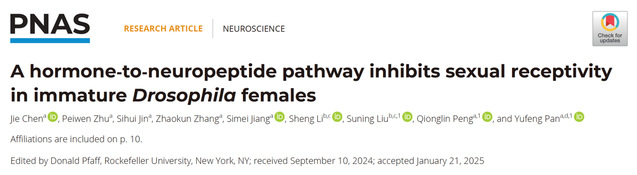 2月22日, 生命科学与技术学院、新生学院潘玉峰教授团队在《美国科学院院刊》(PNAS)上发表题为A hormone-to-neuropeptide pathway inhibits sexual receptivity in immature Drosophila females(《一条抑制未成熟雌性果蝇性接受行为的激素-神经肽通路》)的研究论文,揭示了一条从激素到神经肽的信号通路协调动物性发育与性行为。这也是近三年来潘玉峰教授团队第三次在《美国科学院院刊》发表研究成果(PNAS, 2022, 2024, 2025)。