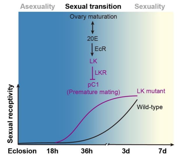 研究团队进一步发现,LK抑制幼年雌蝇性行为的功能受到昆虫生长发育的重要激素——蜕皮激素(ecdysone)的调控。蜕皮激素受体(EcR)在LK神经元中表达,蜕皮激素通过EcR调控LK神经元的活性,进一步抑制雌蝇的接受行为。此外,研究还发现神经肽LK的受体LKR在雌蝇接受行为的整合中枢pC1神经元中表达,并通过抑制pC1神经元的活性来调控雌蝇的接受行为。