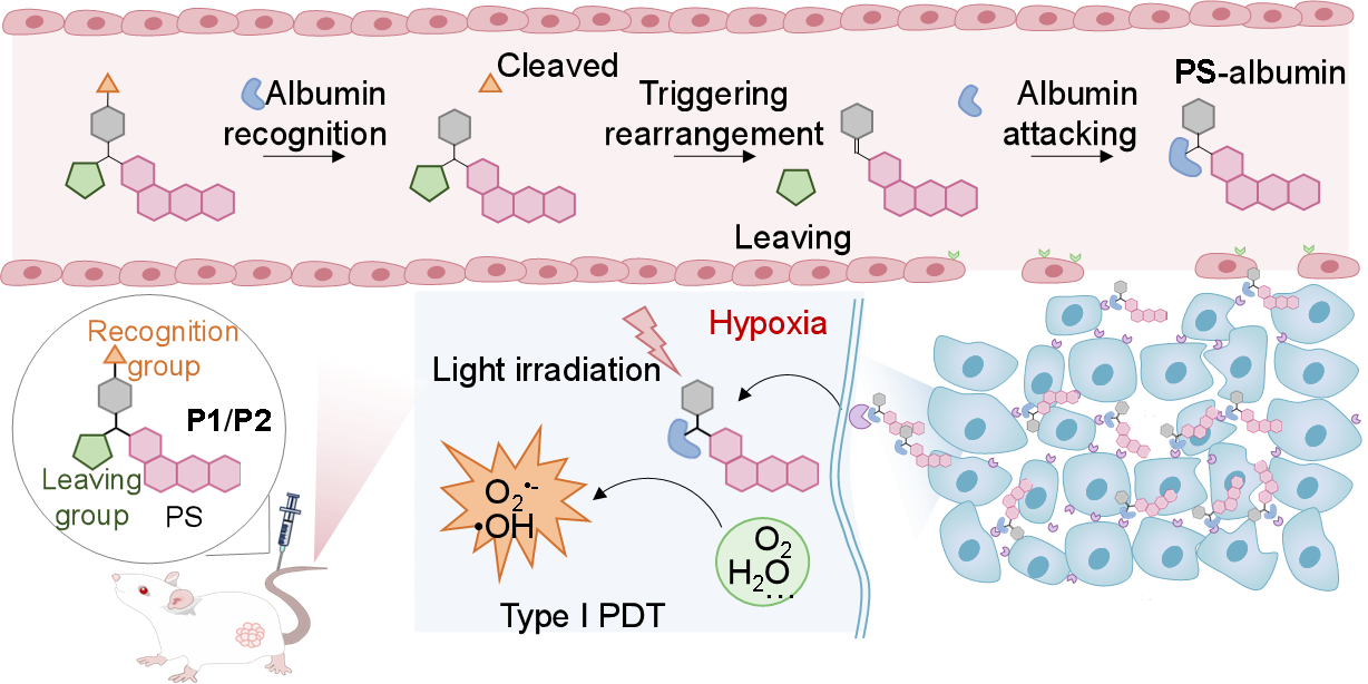 目前,通过开发人工载体,光敏剂可借助增强EPR效应或主动靶向修饰,有效地递送并积聚于肿瘤组织。然而,多功能载体仍面临严峻挑战,如不确定的长期生物安全性、有限的生物降解性、以及快速清除等问题。相较于人工载体,白蛋白作为一种天然的"隐形"载体,具有较长的循环半衰期,并能通过受体介导的胞吞作用实现内在的肿瘤归巢能力,提供了一种有吸引力的替代方案。然而,现有的白蛋白劫持策略主要依赖体外或通过共价/非共价结合在体内原位构建,存在若干问题,包括:(1) 物理吸附或疏水性结合导致对药物-白蛋白相互作用的控制不足以及脱靶释放;(2) 体外多重合成过程导致的生物活性降低、制备问题以及结果不可重复;(3) 在体内给予治疗剂后与白蛋白相互作用时,可能受到某些物质如蛋白质的干扰。