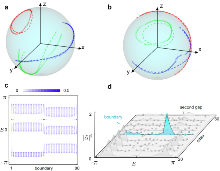 在该量子行走体系中,研究团队通过动力学测量的方法提取体系的非阿贝尔拓扑荷。通过量子态层析重构体系的演化算符,可以获得不同能带本征态随动量变化形成的轨迹。如图2(a)(b)所示,不同能带的本征态在单位球面上形成闭合轨迹。这些轨迹所对应的拓扑结构编码了体系的四元数拓扑荷。实验结果表明,该体系具有非平凡的非阿贝尔拓扑结构。
