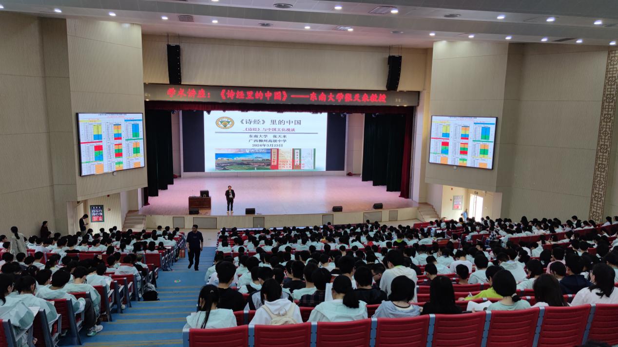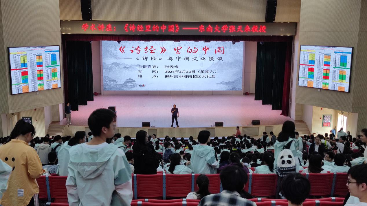 2024年3月23日, 广西招生组邀请人文学院张天来副教授赴柳州高中开展人文素质讲座和招生宣传。张老师向柳州高中一千余名师生,开展了“《诗经》里的中国——《诗经》与中国文化漫谈”主题讲座与交流。
