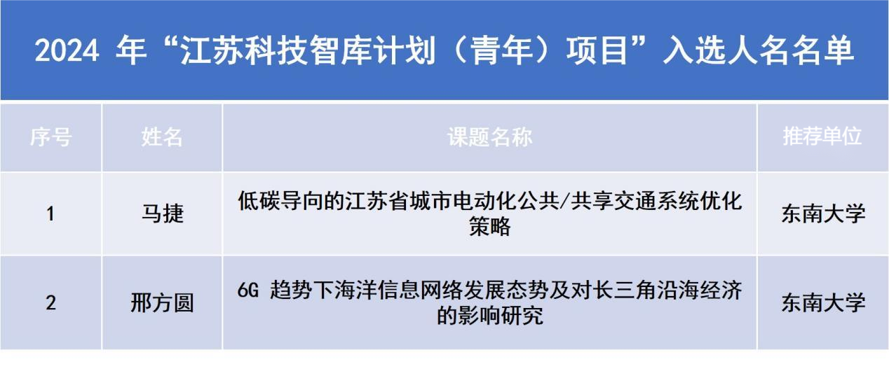 近日,江苏省科协公布了2024年“江苏科技智库计划(青年)项目”入选人名名单。通过 科协申报的交通学院马捷、网安学院邢方圆2位教师入选。