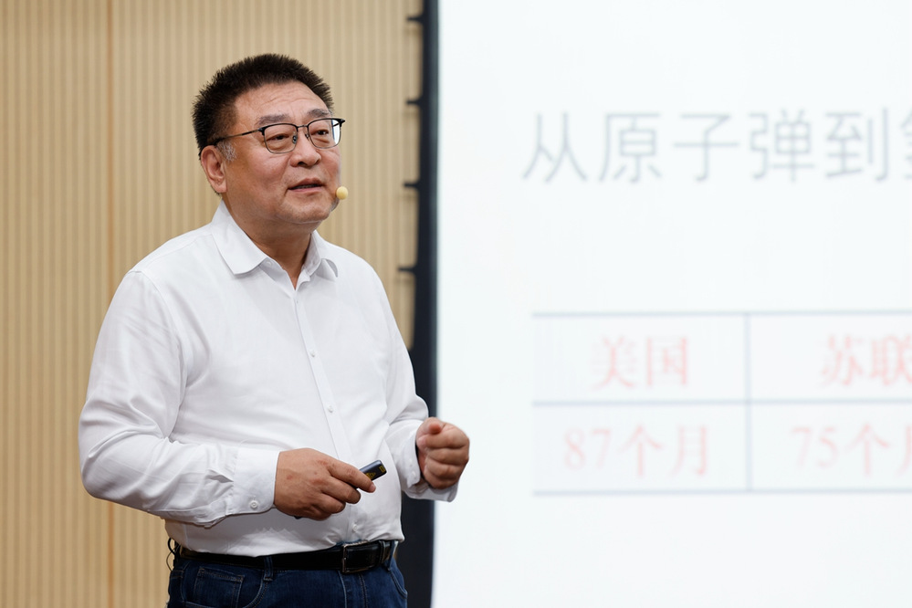 朱明远以《朱光亚的1964》为题,用一张张老照片、一个个动人故事,串起了朱光亚紧张而忙碌的1964,还原了朱光亚临危受命、深入一线、坐镇前线、筑起核盾的科研足迹。他回忆道,朱光亚解决科学技术问题极度严谨缜密,“细致到每一个微小的瑕疵都不放过”,这种严谨的品质深刻地影响了他一辈子。朱明远深情地说:“我们这个世界,每年都会发生那么几件惊天动地的大事。1964年的大事,属于中国。朱光亚,他一生为一件大事来,让我们记住他,为大事生,求大事干,吟大事歌,写大事记。”动人的讲述让师生泪目,现场爆发热烈掌声。